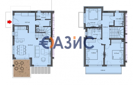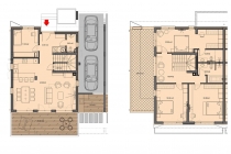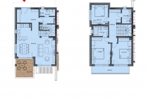 Първият етаж включва просторна всекидневна, комбинирана с кухненски бокс, спалня, баня за гости и голяма покрита тераса. Това пространство е идеално за ежедневието и приемането на гости — уютната всекидневна, плавно преминаваща в трапезарията, създава атмосфера на уют и домашна топлина, а терасата се превръща в естествено продължение на интериора, където можете да се отпуснете на чист въздух.