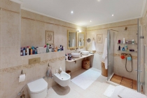 Das Badezimmer ist mit Sanitärkeramik, Bidet, Duschkabine, Waschmaschine ausgestattet.